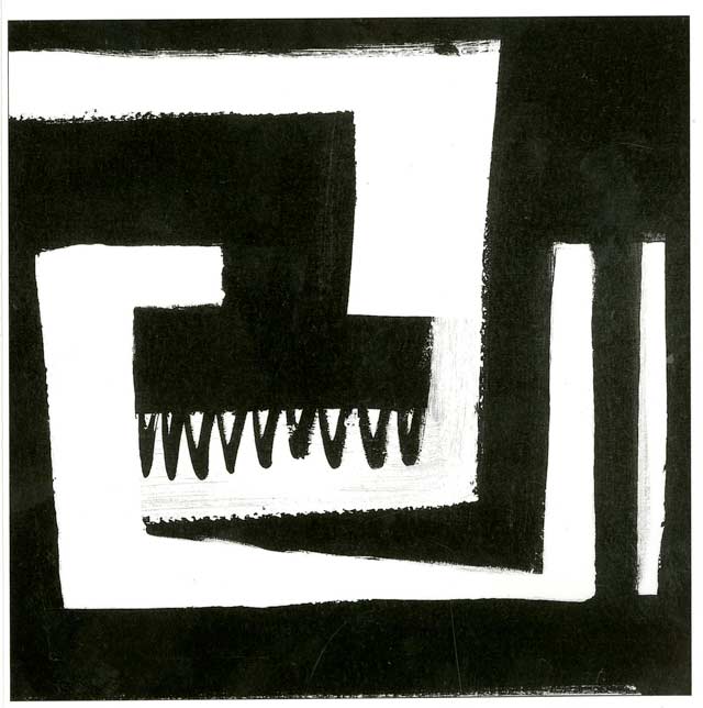 O quadrado preto possui uma pequena abertura do lado esquerdo que lembra a entrada de um labirinto onde o espaço branco funciona como convite-guia até a seguinte situação: uma faixa grossa, cuja base de pontas se assemelha a uma arcada dentária só de caninos, surge de cima corpulenta e opressiva. O oprimido, logo abaixo, é um traço fino que se salva do esmagamento por um mínimo espaço branco. Avançando no labirinto, o caminho fica cada vez mais estreito até que, sem opção, somos impelidos a subir por um bloco branco vertical dividido pelo meio por um traço preto – pesado – bem delineado. Não tem saída.